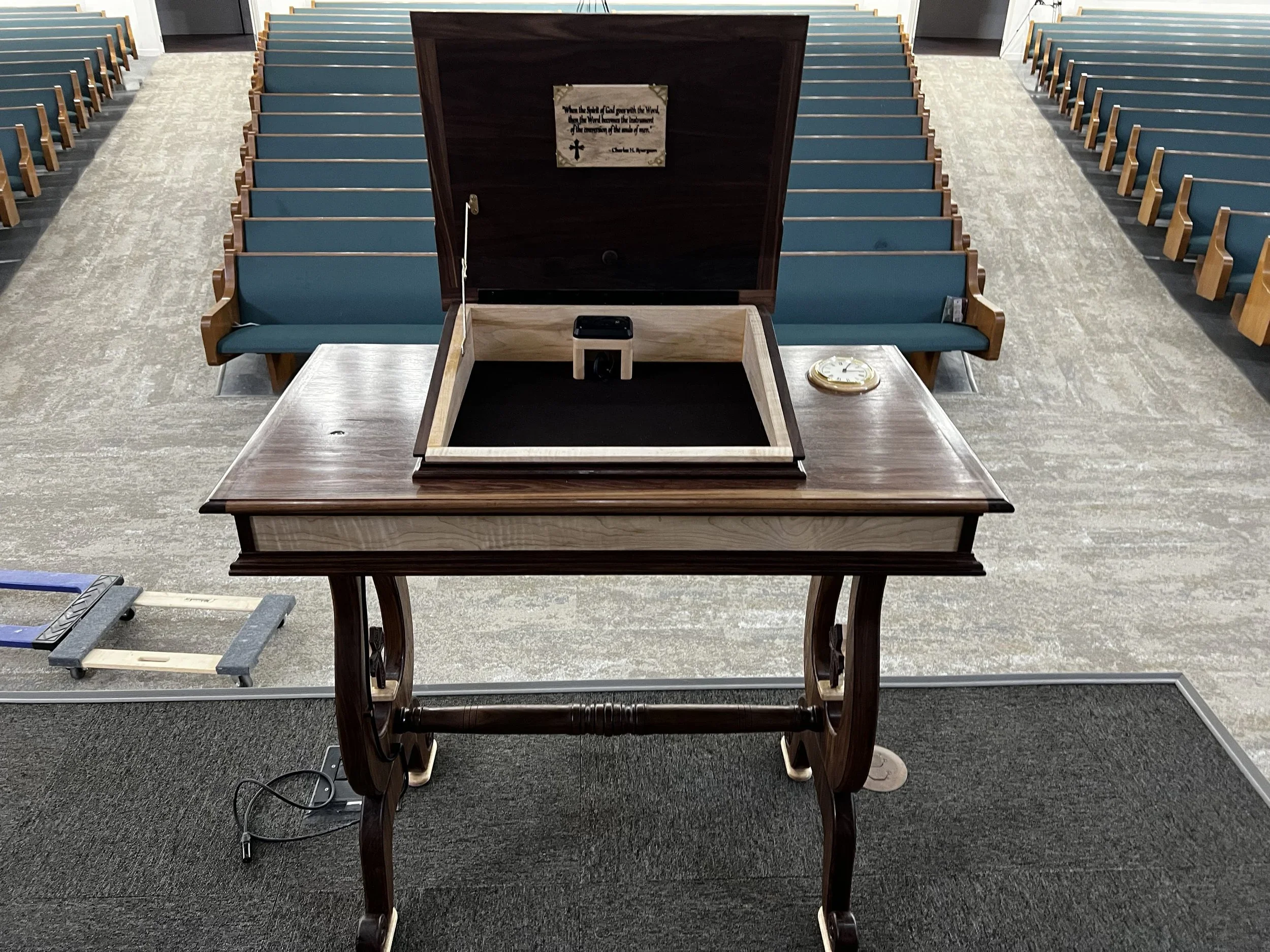 On April 15, 2023, Johnna McKinnon delivered the finished product to our church. Simply put, it looks amazing! The colors, the woodwork, the embedded clock (like Spurgeon’s,) and the engraved Spurgeon quote under the lid makes this a perfect desk from which to preach.